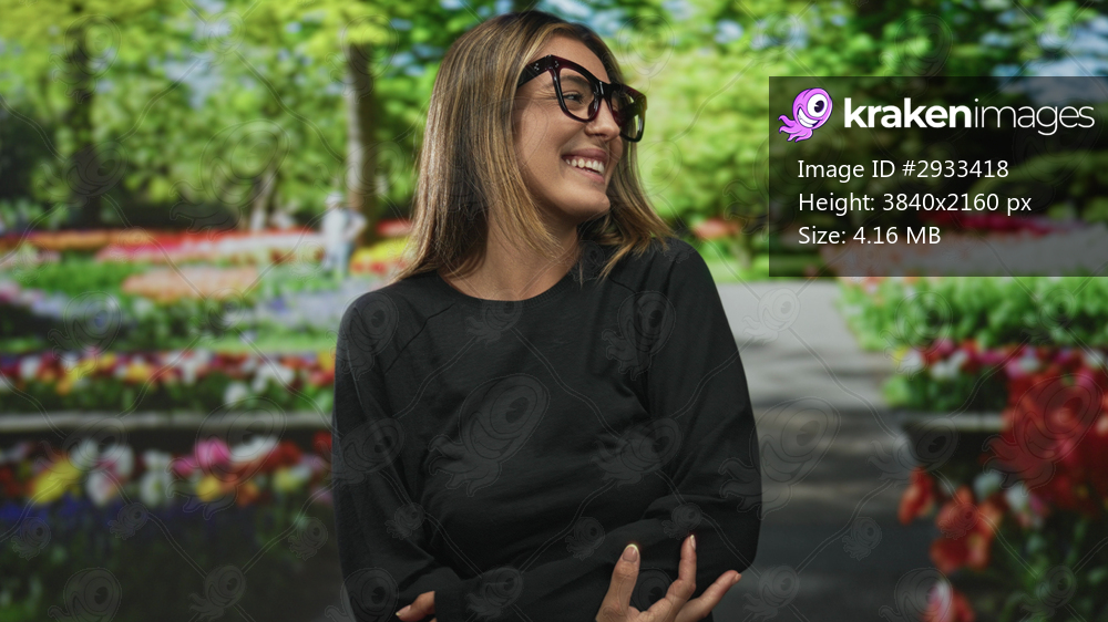 Woman hugs herself wearing glasses in a park among colorful flowerbeds and green trees; self care contentment.