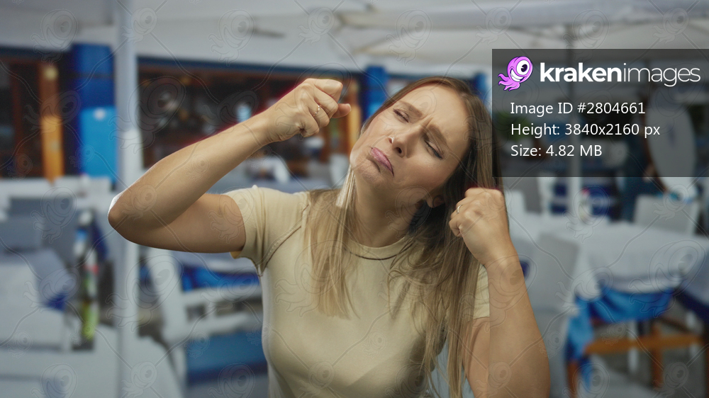 Woman humorously crying while seated at an outdoor terrace restaurant in a city setting, surrounded by tables and chairs, conveying a playful and lighthearted atmosphere. - Kraken Images