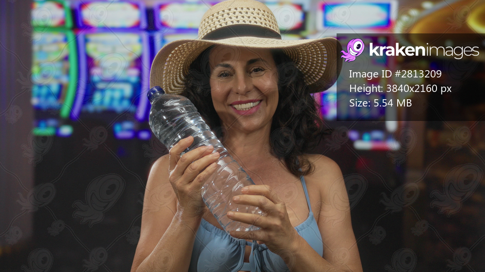 Woman in a bikini holding a water bottle indoors at a casino with slot machines in the background, wearing a hat, looking joyful during her visit.