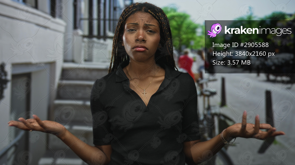 Woman in a black shirt shrugging with palms up and cross pendant visible on a city street near stairs; confusion doubt.