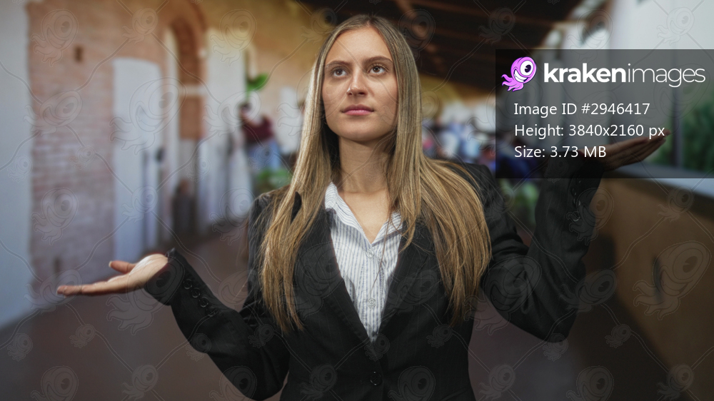 Woman in a building corridor with palms up shrug wearing a blazer and striped shirt, arms slightly extended; skepticism doubt indecision questioning.