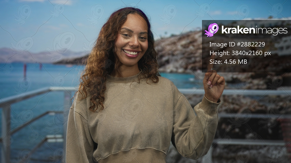 Woman in a casual sweater points finger near a metal railing on a seaside street pier, smiling with closed eyes and relaxed posture; cheerful confidence. - Kraken Images
