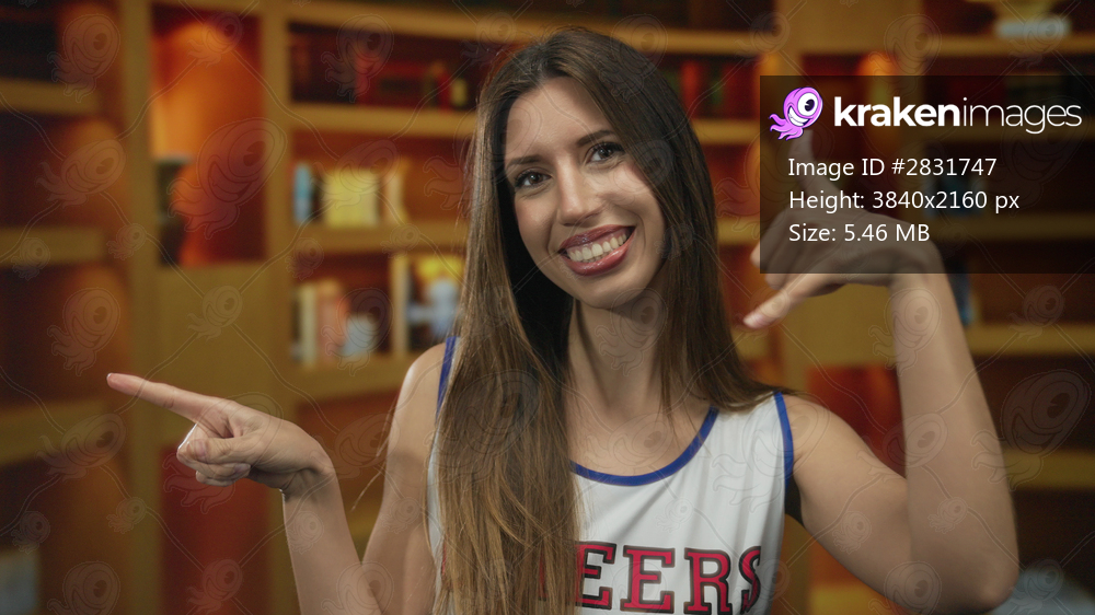 Woman in a cheerleader uniform pointing finger at books on wooden shelves in a library room; invitation.