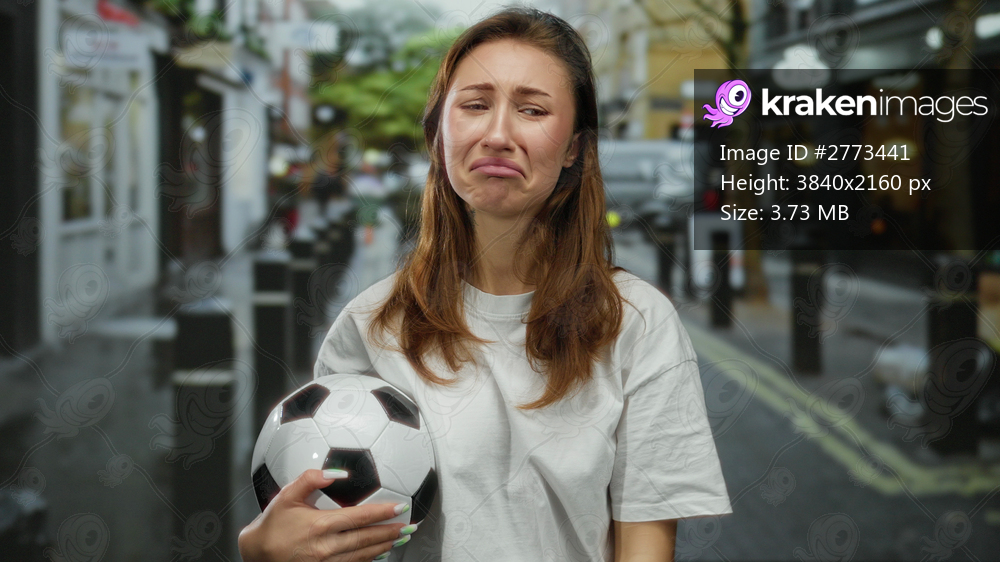 Woman in a city street holding a soccer ball with a sad expression, depicting emotion, outdoor scene, wearing casual white clothing, surrounded by urban cityscape. - Kraken Images