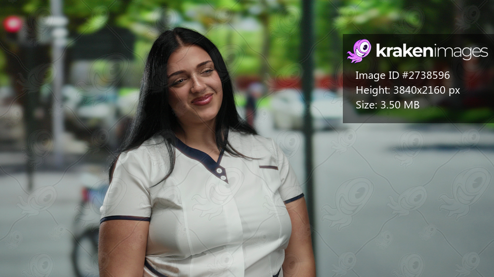 Woman in a city street, smiling confidently, with motorcycles and cars surrounding, demonstrating a vibrant outdoor urban lifestyle.