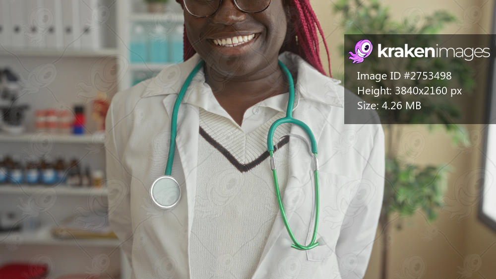 Woman in a clinic wearing a white coat and stethoscope smiling in a medical workplace, representing healthcare professionalism.