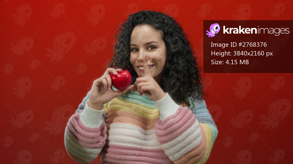 Woman in a colorful sweater gestures for silence while holding a red heart against a vibrant red background, depicting a secretive yet loving mood.
