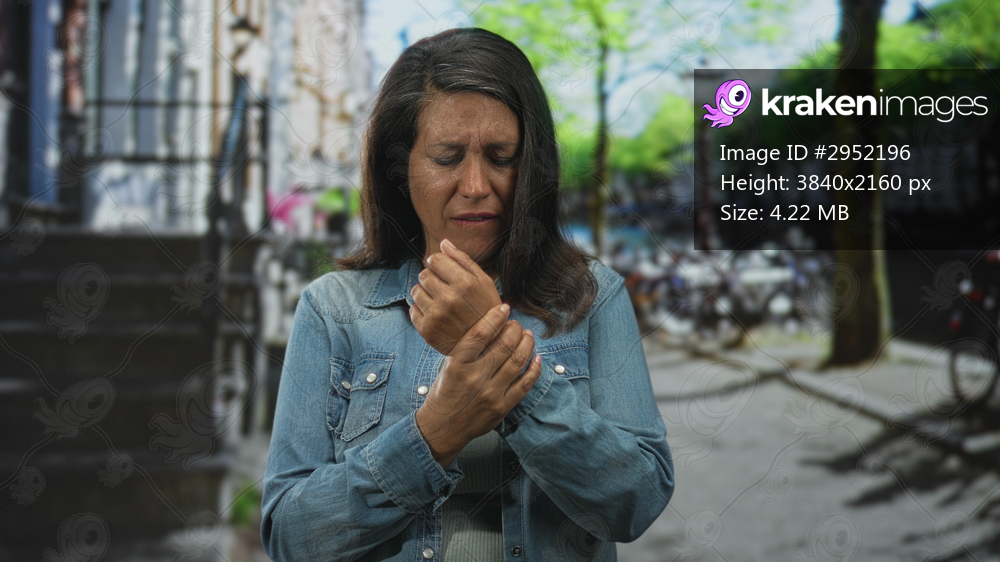 Woman in a denim jacket clutching her wrist with both hands on a tree lined street, grimacing and rubbing the painful wrist after a sudden twinge; discomfort concern vulnerability. - Kraken Images