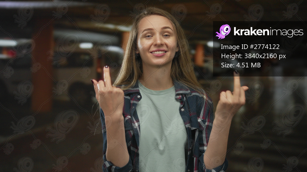 Woman in a flannel shirt making playful gestures in an indoor parking area, conveying a cheeky mood while standing near parked cars, with a confident expression on her face. - Kraken Images