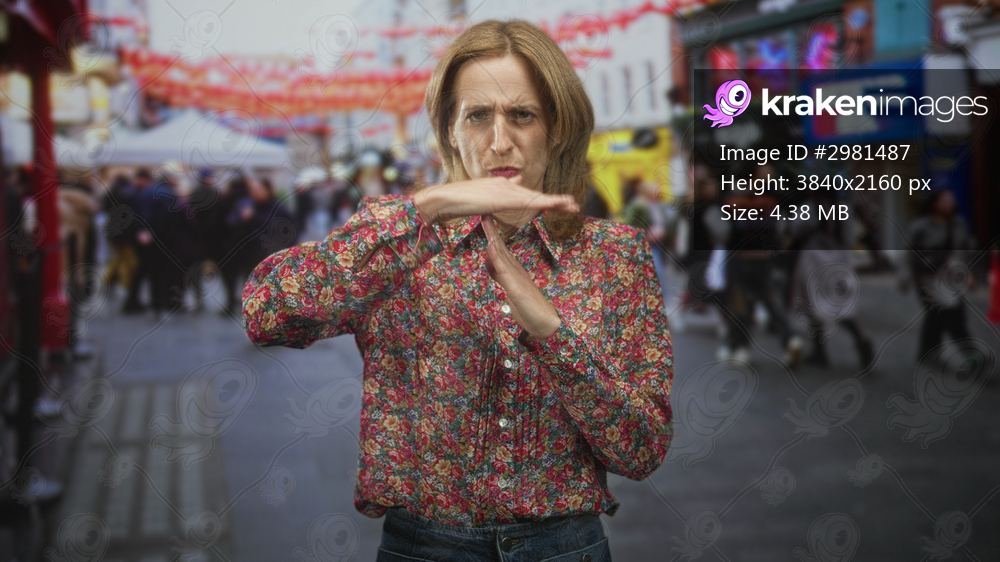 Woman in a floral blouse making chopping and palm gestures while speaking in a crowded street market with lanterns and shopfronts visible; frustration protest. - Kraken Images