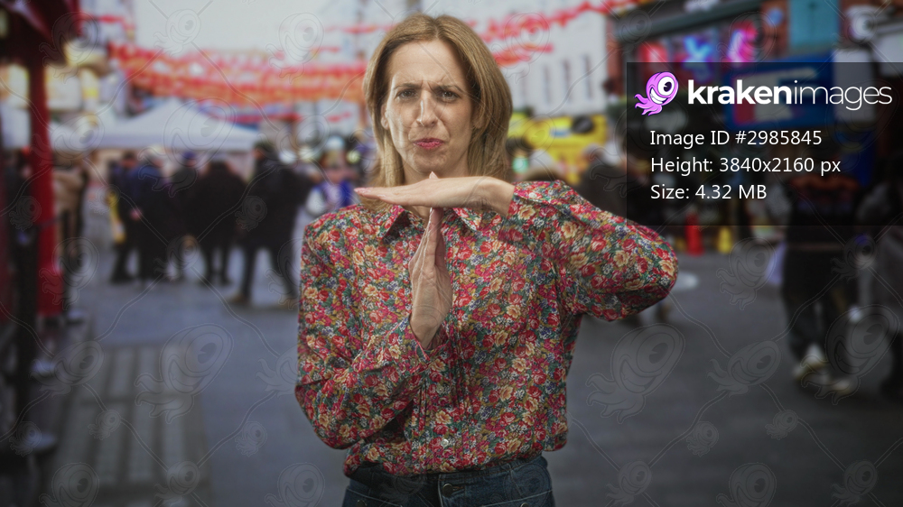 Woman in a floral blouse making chopping and palm gestures while speaking in a crowded street market with lanterns and shopfronts visible; frustration protest. - Kraken Images
