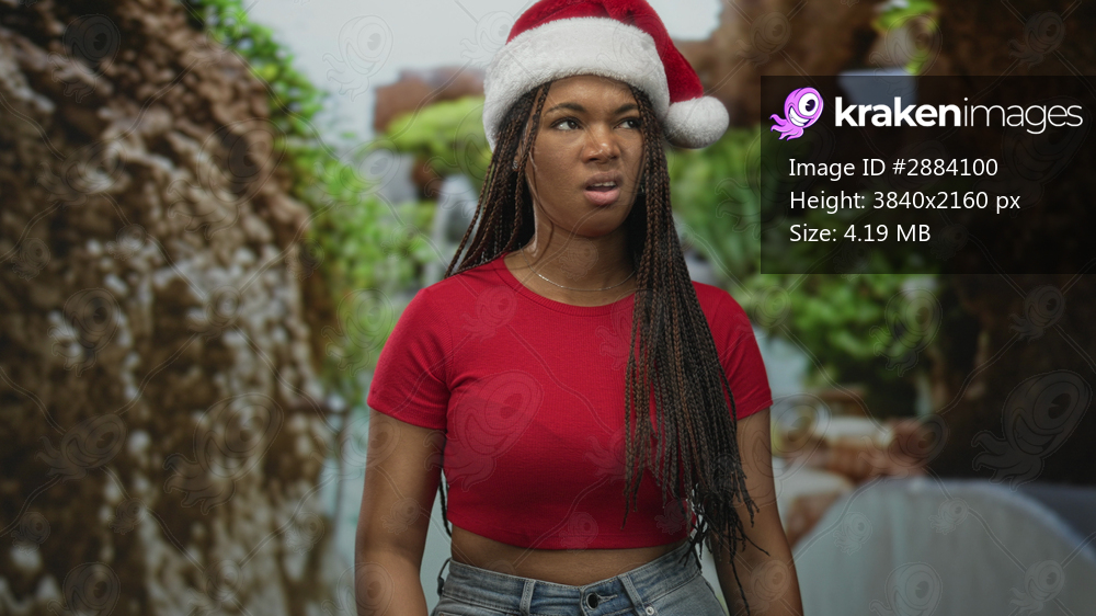 Woman in a forest wearing a santa hat grimaces while showing bare midriff in a fitted red crop top and low waist denim jeans, long braids visible; holiday annoyance. - Kraken Images
