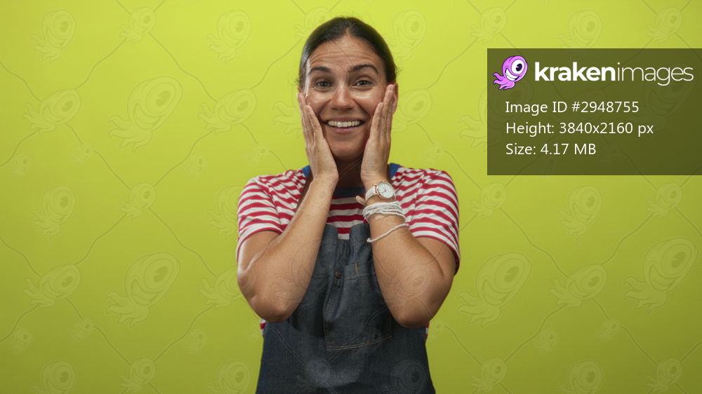 Woman in a green studio wearing a striped shirt and denim apron with hands on cheeks and open mouth, facing camera; surprise.