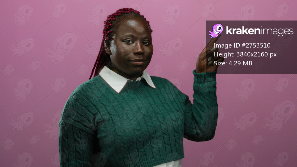 Woman in a green sweater with braided hair pointing at something against a pink background, suggesting direction or attention in a studio setting.