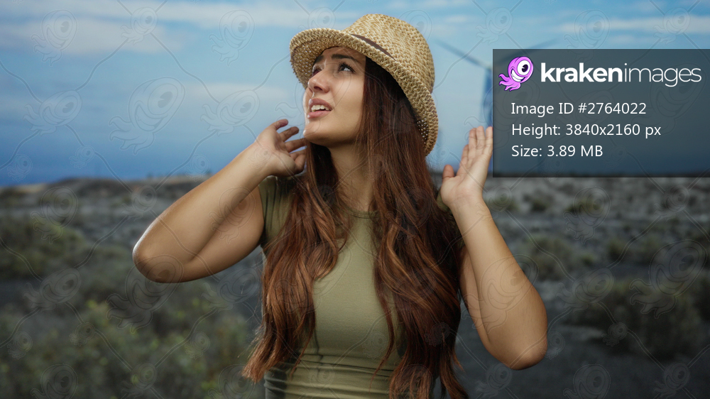 Woman in a hat covering her ears from noise, standing in a field with a windmill in the background, expressing discomfort due to the outdoor windy environment. - Kraken Images