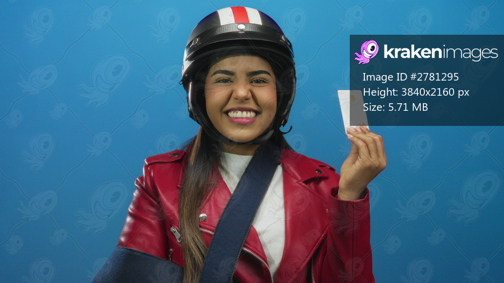 Woman in a helmet showing a credit card with a smile, wearing a sling and a red jacket, against a blue background.