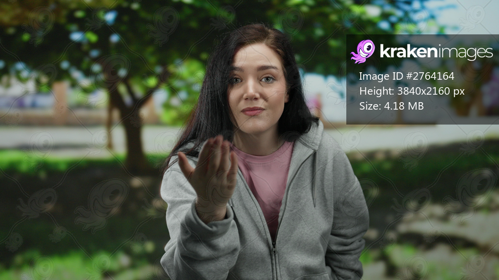 Woman in a park gestures towards the camera with a smile, surrounded by lush green trees, wearing a gray hoodie.