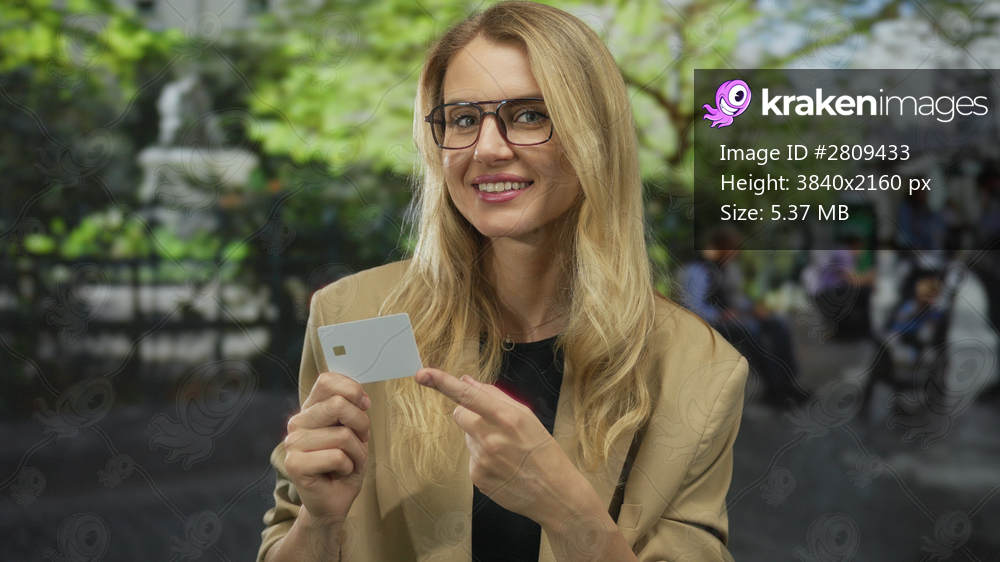 Woman in a park outdoors holding and pointing at a credit card, wearing glasses with green trees and people blurred in the background, showing a casual sunny day. - Kraken Images