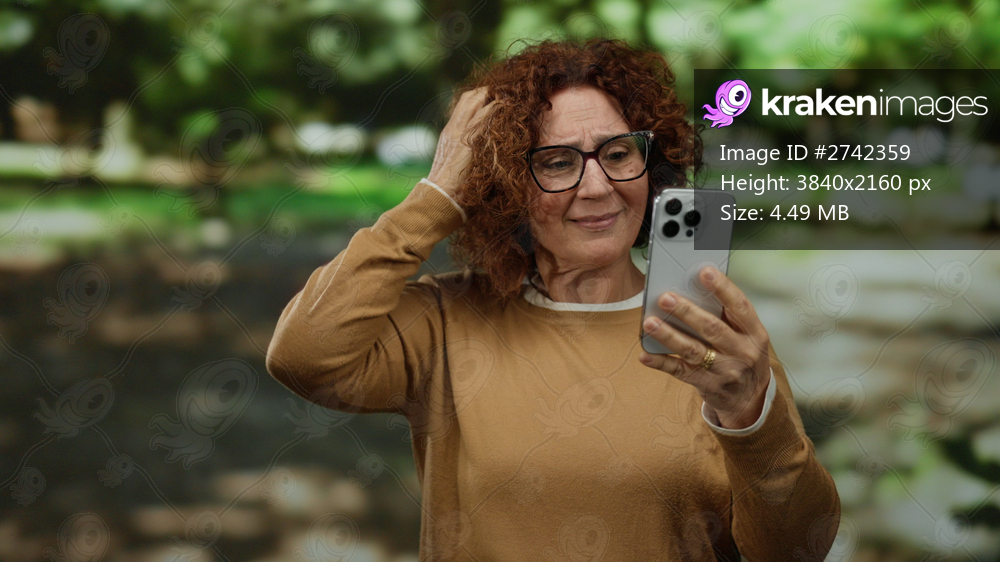 Woman in a park using smartphone, capturing a casual moment, brown sweater and glasses, surrounded by nature, displaying a thoughtful expression in an outdoor setting. - Kraken Images
