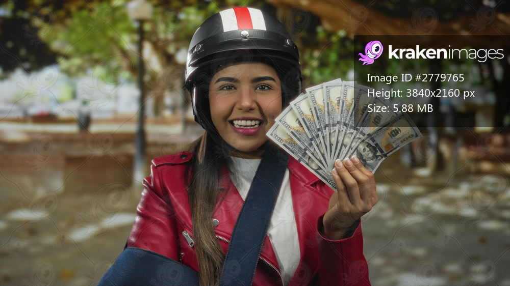 Woman in a park wearing a helmet and sling shows us dollars with a smile while holding a motorbike helmet, surrounded by greenery.