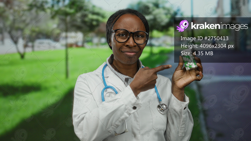 Woman in a park wearing glasses and a white coat with a stethoscope, holding and pointing to a pill bottle, surrounded by greenery and outdoors, conveying a professional setting. - Kraken Images