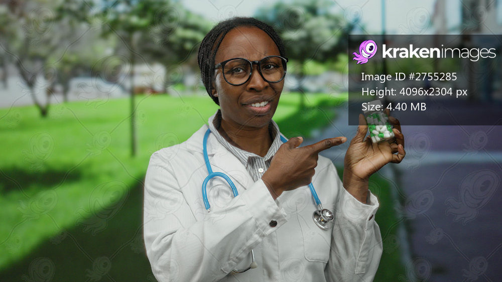 Woman in a park wearing glasses and a white coat with a stethoscope, holding and pointing to a pill bottle, surrounded by greenery and outdoors, conveying a professional setting. - Kraken Images