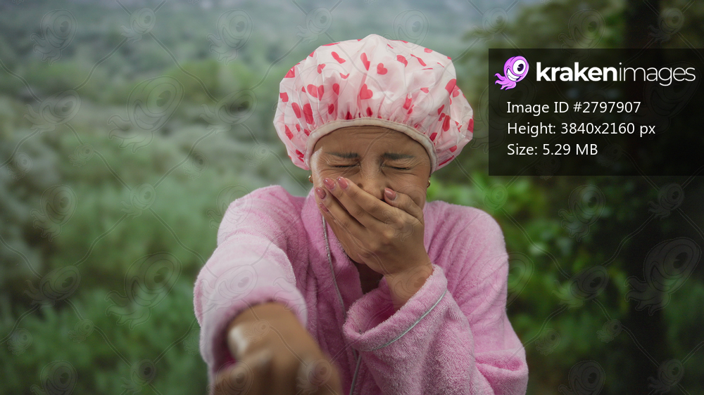Woman in a pink bathrobe and shower cap joyfully covering mouth while pointing and laughing in a lush green park outdoor setting.