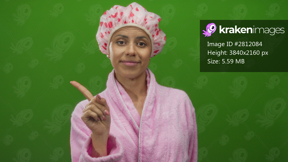 Woman in a pink bathrobe and shower cap pointing upward with one finger against an isolated green background, conveying a message of emphasis or importance. - Kraken Images
