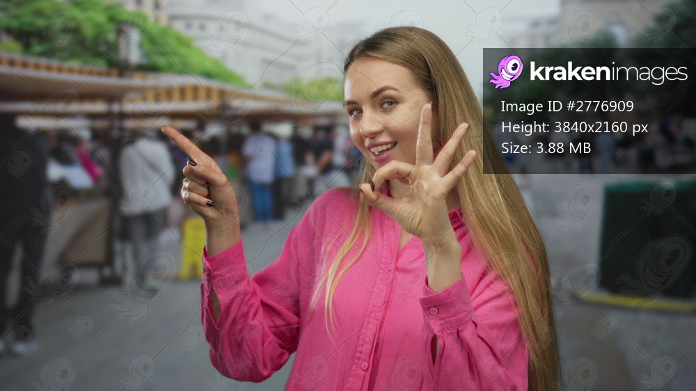 Woman in a pink shirt gesturing ok and pointing while smiling in an outdoor city market setting with blurred background of people and stalls.