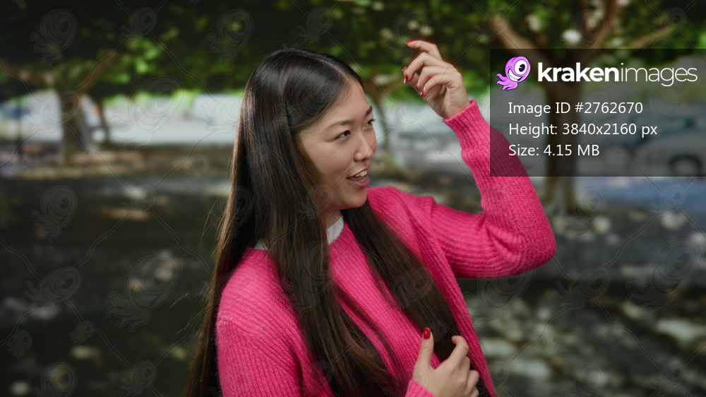 Woman in a pink sweater gestures playfully outdoors in a park with trees, smiling and enjoying a sunny day.