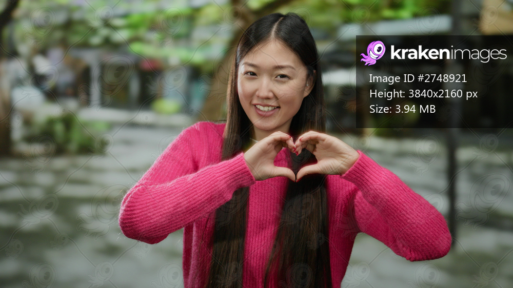 Woman in a pink sweater making a heart shape with hands in a city street on a bright day, embodying joy,happiness,and love,with urban backdrop.