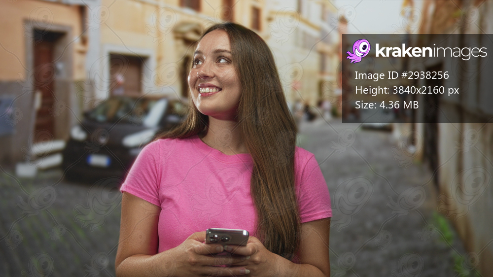 Woman in a pink tshirt texting on a smartphone with fingers visible while standing on a cobblestone street near parked cars and storefronts; contentment connection. - Kraken Images