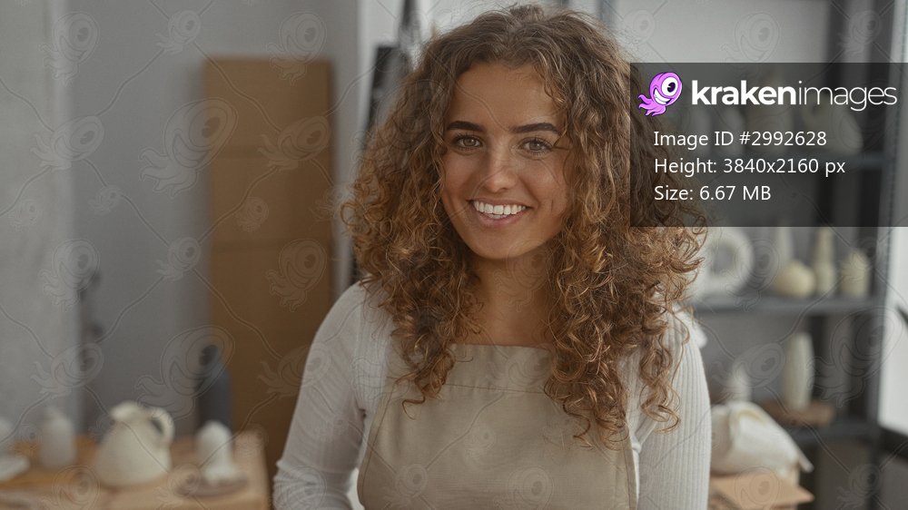 Woman in a pottery studio holding a smartphone among ceramic vases and shelves, wearing an apron and hands visible; creative joy.