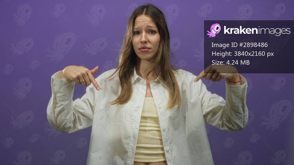 Woman in a purple studio wearing a white oversized shirt points both index fingers to her shirt with a puzzled frown; doubt.