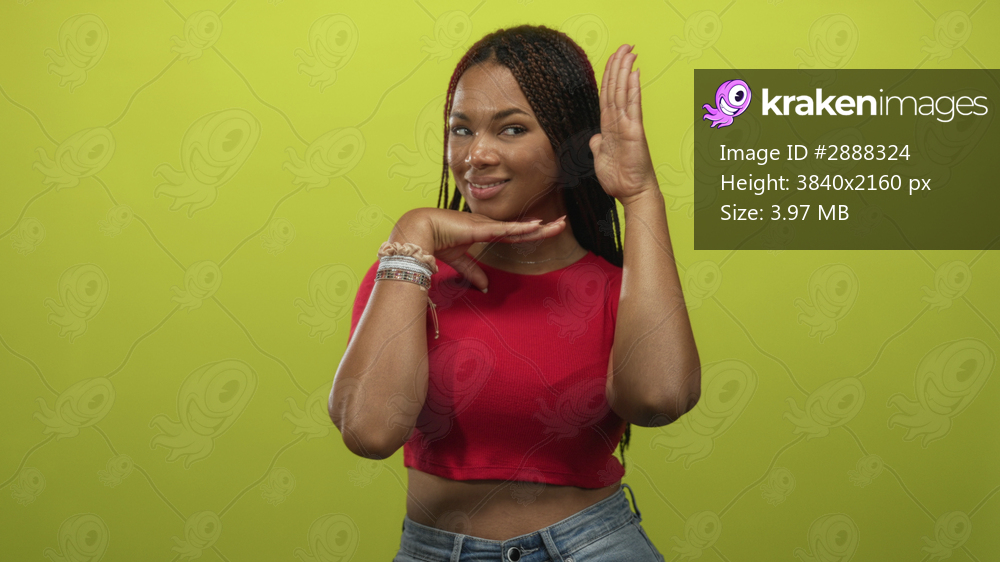 Woman in a red cropped top and jeans framing chin with raised palm in studio with lime green wall; playful confidence.