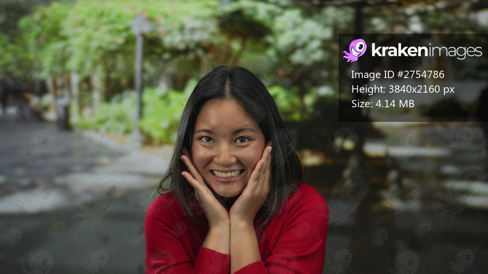 Woman in a red sweater expresses joy and surprise in a lush park setting during daylight, capturing vibrant autumnal energy with youthful charm and candid emotion outdoors. - Kraken Images