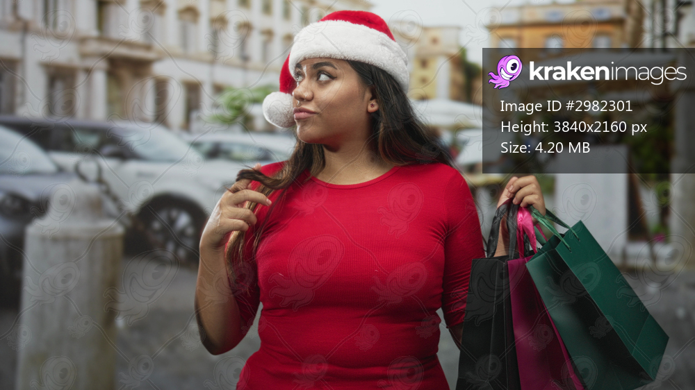Woman in a santa hat holding multiple shopping bags and twirling hair with a pouting expression on an urban street lined with shops; holiday frustration. - Kraken Images