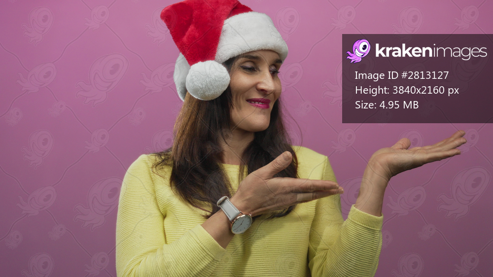 Woman in a santa hat smiles against a pink wall, wearing a yellow sweater and presenting with open palm hands, embodying festive and cheerful holiday spirit. - Kraken Images