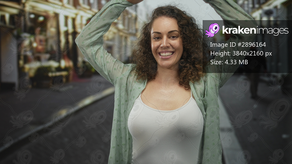 Woman in a sheer green shirt and white tank top showing breasts, arms raised above head smiling while standing on a city street with blurred shops and pavement; joy. - Kraken Images