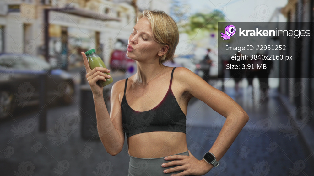 Woman in a sports bra and leggings holds and kisses a green juice bottle, hand on hip, smartwatch visible, smiling on street; healthy confidence.
