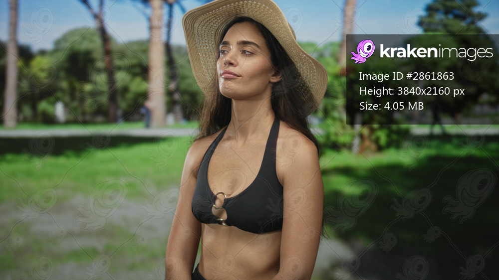 Woman in a straw hat touches her hair while standing among sunlit green trees in a forest clearing; serenity.