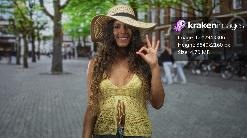 Woman in a straw sunhat points finger and makes ok sign while wearing a yellow knit top on a cobblestone street; confidence summer.