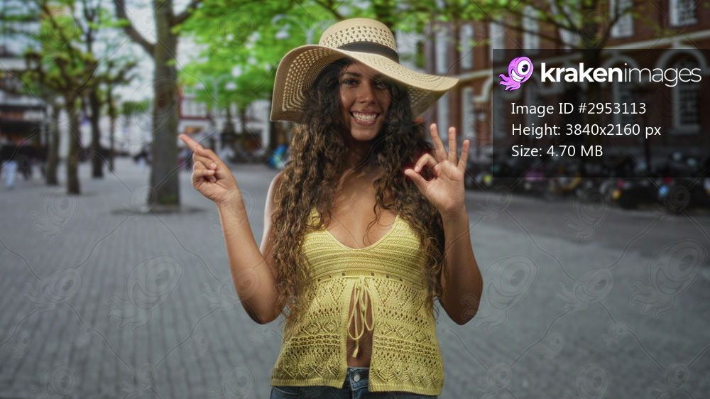 Woman in a straw sunhat points finger and makes ok sign while wearing a yellow knit top on a cobblestone street; confidence summer.
