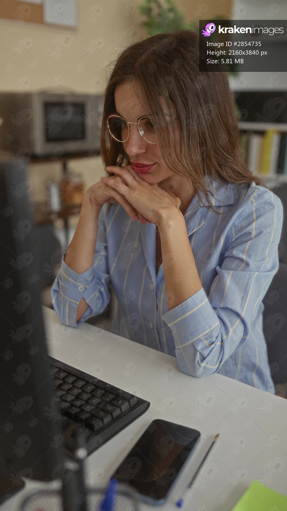 Woman in a striped blue shirt with hands clasped under chin at office desk beside keyboard and smartphone; contemplation.