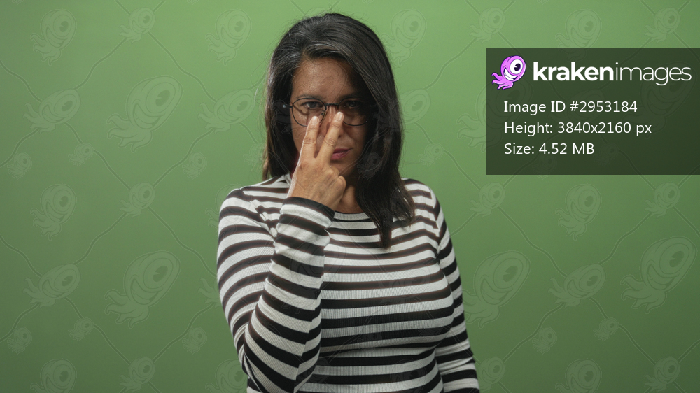 Woman in a striped shirt and glasses places two fingers at the bridge of her nose while looking at camera in a studio; concentration instruction.