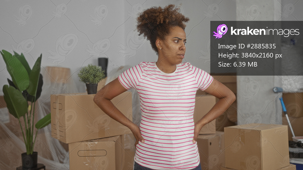 Woman in a striped shirt with hands on hips standing among stacked moving boxes in a building interior with potted plant and packing supplies visible; moving frustration. - Kraken Images