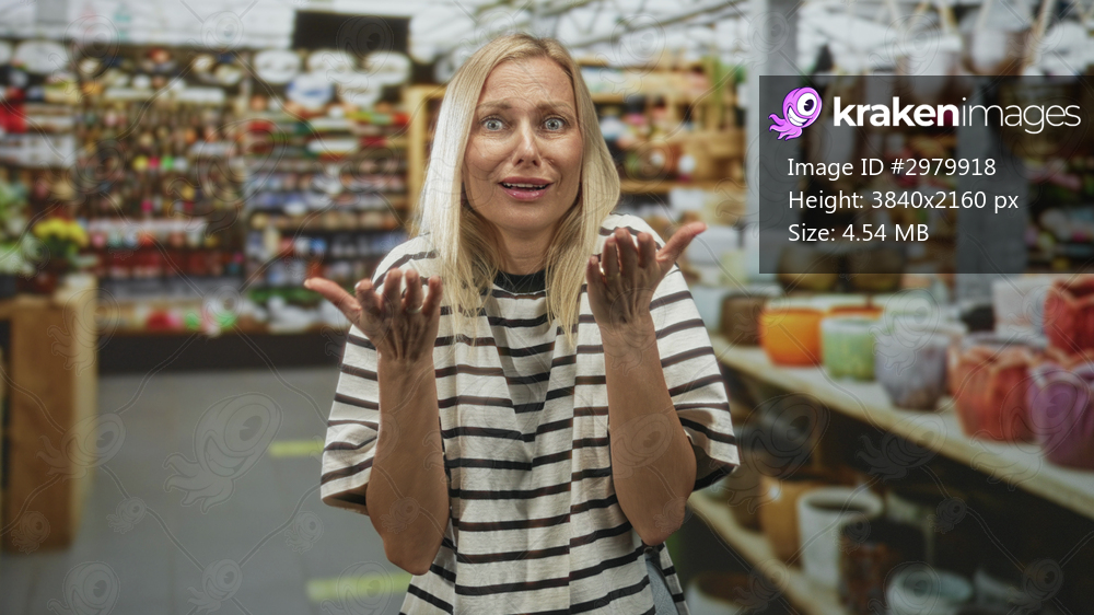 Woman in a striped shirt, middle aged and blonde, showing open hands and expressive face while gesturing in a garden center building aisle near pottery displays; frustration. - Kraken Images