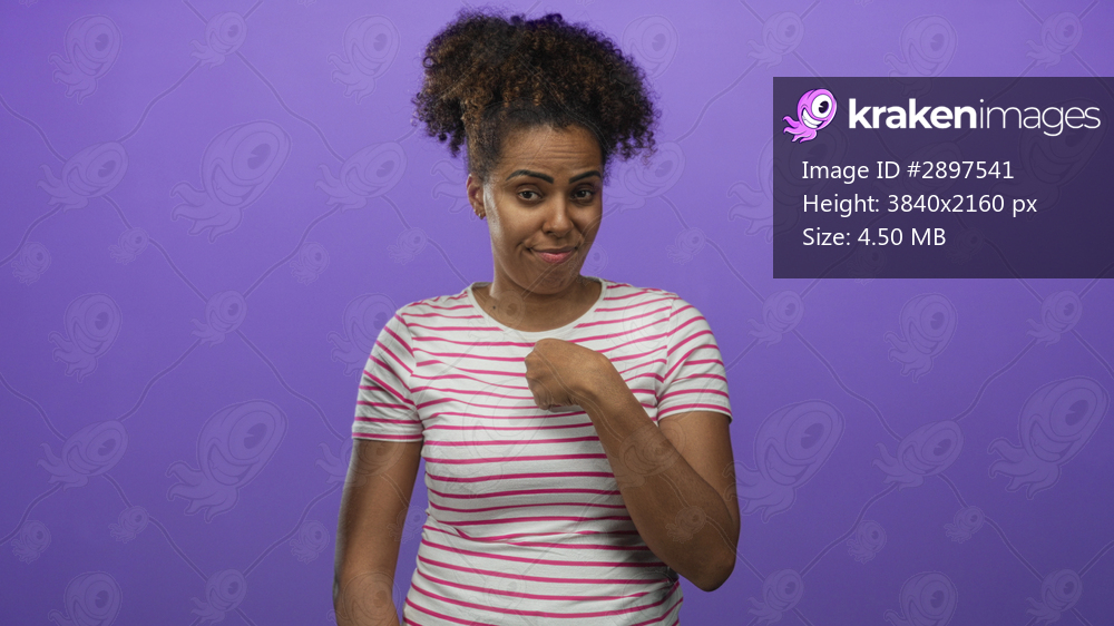 Woman in a striped t shirt pointing with finger in a purple studio, sometimes crossing her arms and raising one index finger; skepticism.