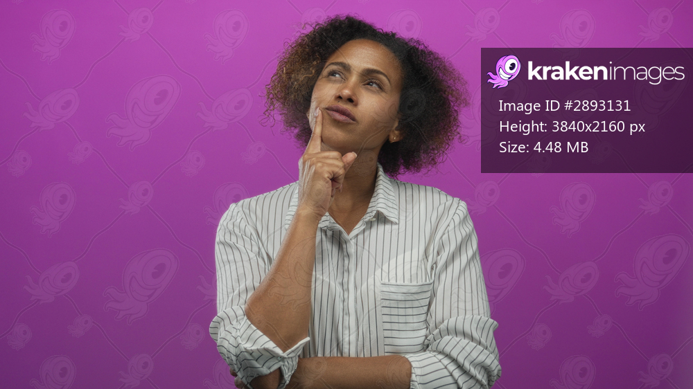 Woman in a striped white shirt with finger to cheek and folded arms in a purple studio; thoughtful reflection pondering curiosity.
