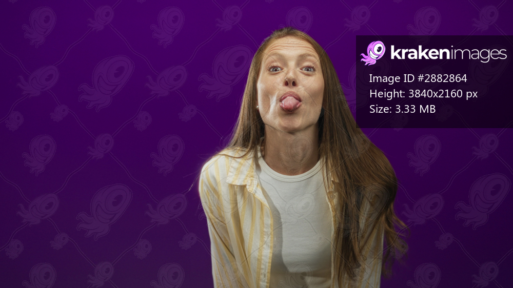 Woman in a striped yellow shirt sticking tongue out toward the camera in a purple studio, leaning forward slightly; playful cheeky attitude.